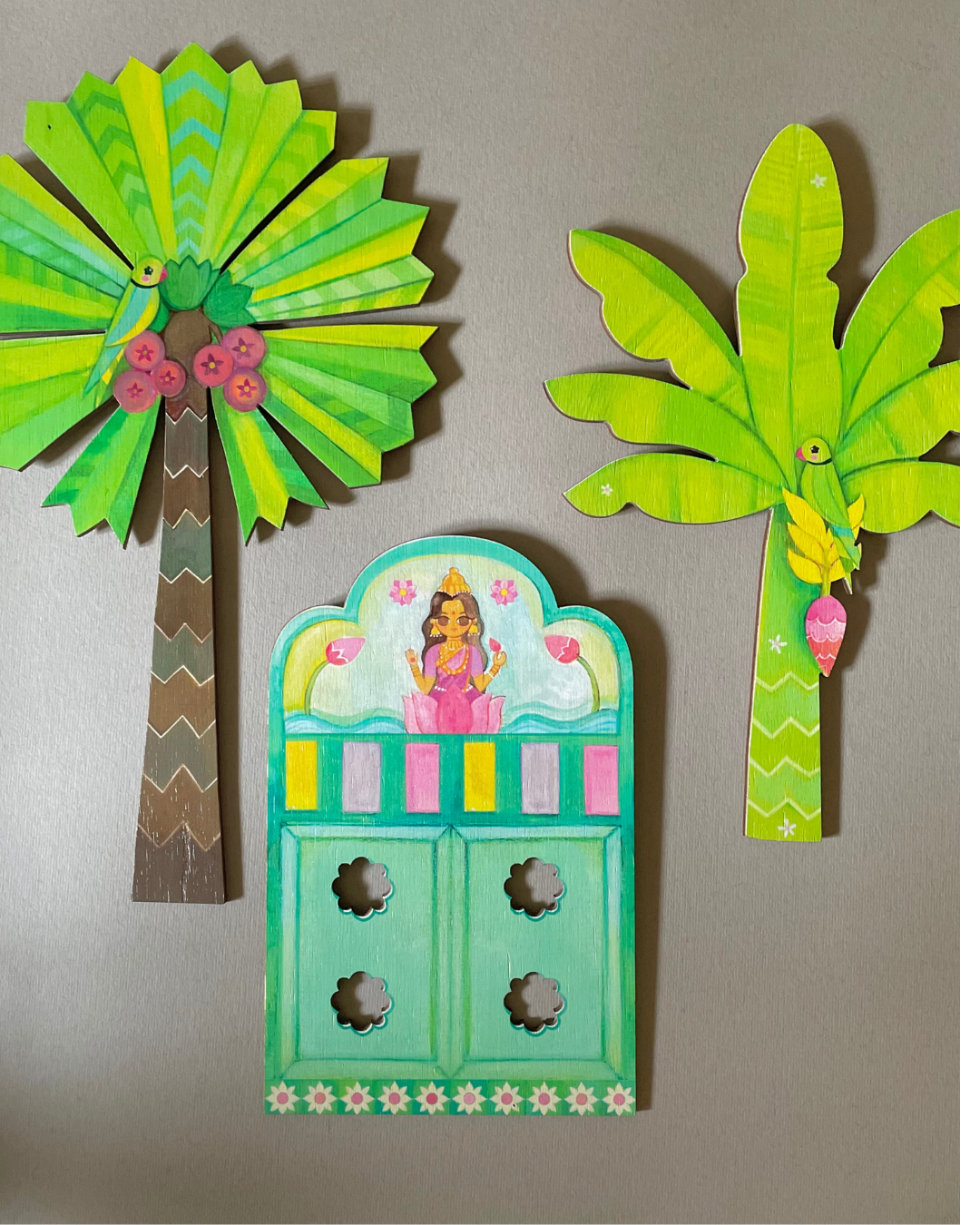 A quirky twist on tradition! This birchwood plaque is inspired by the charming windows of heritage South Indian homes, with a playful carved window design and a delicate Lakshmi illustration at its heart. Perfect for adding a little cultural flair and handcrafted charm to your space – because everyday decor should be as fun as it is beautiful!
